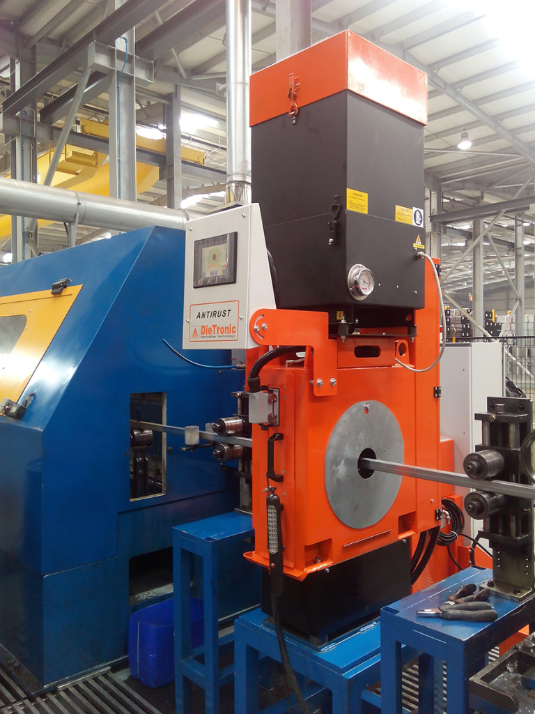 Een voorbeeld waar dit nodig is, zijn buizen voor de auto-industrie. Het systeem kan worden aangepast aan buizen van verschillende vormen en afmetingen en bestaat uit drie hoofdcomponenten: een bedieningskast met aanraakscherm (invoer en controle van alle hoofdparameters), een tank van 40 liter en een meertraps reinigingskamer. De kamer is voorzien van verdelers van verschillende afmetingen, waar de leiding doorheen kan en waarop vier verdelers de reinigingsolie afgeven. De verdelers zijn onderling verwisselbaar in grootte volgens de buizen die gereinigd moeten worden. Verder twee gaten, een voor reiniging en onderhoud en een voor de automatische afvoer om het gedoseerde product en de verontreiniging die tijdens het reinigingsproces van de buis wordt verwijderd, te kunnen terugwinnen. Deze accessoires, samen met het pneumatische luchtmes, het roestwerende spraysysteem en de minimale hoeveelheid smeertechniek voor het zaagblad, maken allemaal deel uit van DieTronic’s complete oplossing voor het probleem van corrosie.