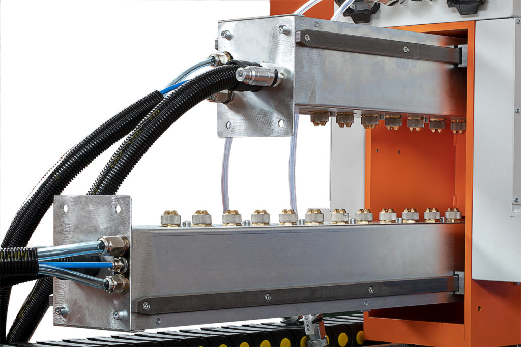 Nieuw in het programma van DieTronic Promax-nozzel smeersysteem. Dit is een systeem die automatische bandsmering mogelijk maakt, waardoor u gebieden kunt selecteren waarop u olie wilt aanbrengen. De configuratie is eenvoudig en flexibel: het standaardsysteem bestaat uit een sproeiunit die verkrijgbaar is in breedtes van 200, 400, 600 en 800 mm en een druktank van 24 l, die gemakkelijk kan worden verwisseld, waardoor ook meer oliën kunnen worden toegepast.